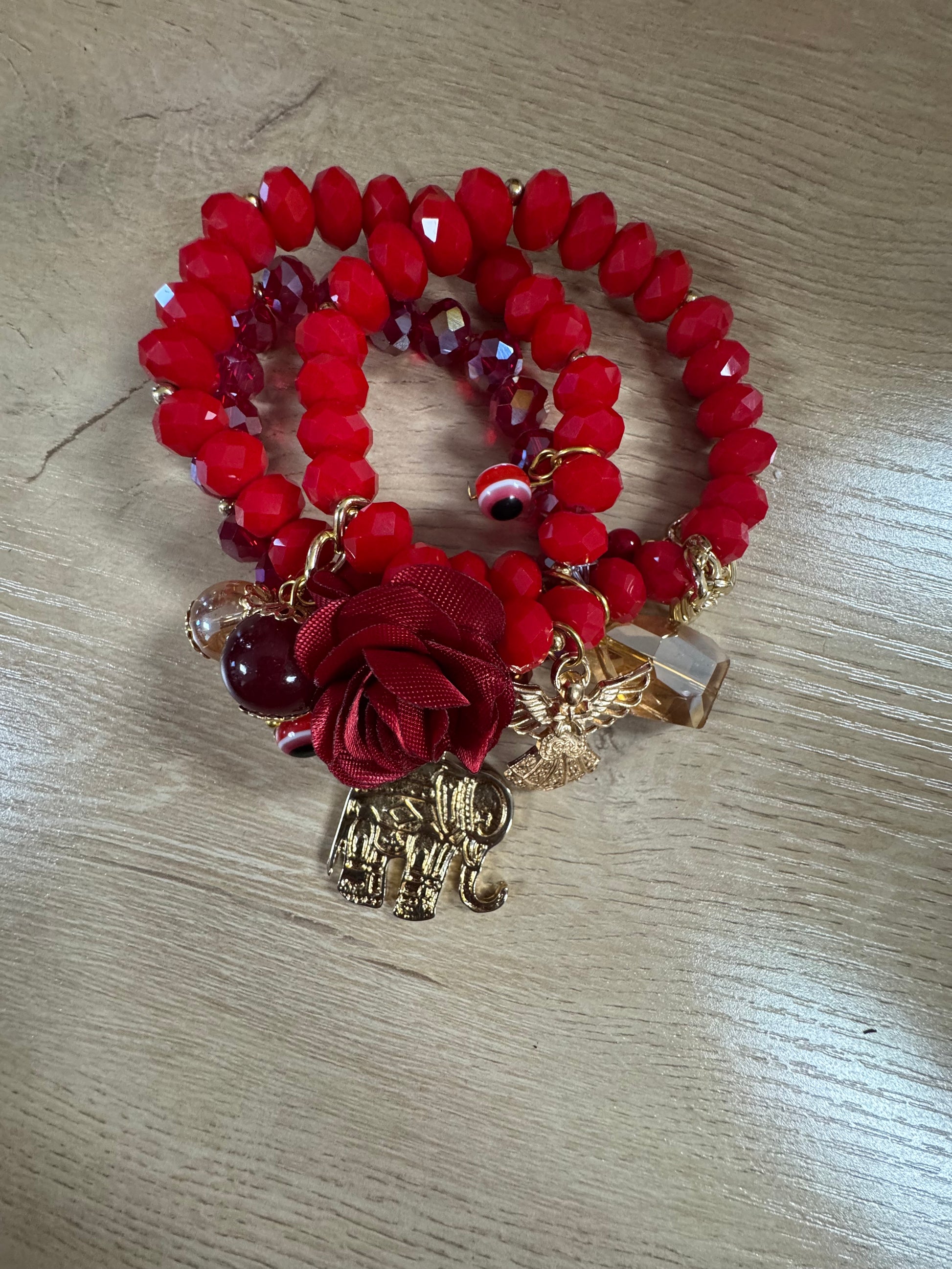 Handmade in México, this bright red crystal bracelet features a mix of good-luck charms including an elephant for fortuna, an angel for protección, an ojo bead, and a soft fabric rose for a touch of love. Easy to style and comfortable to wear, this bracelet brings color, meaning, and a little extra suerte to your day.