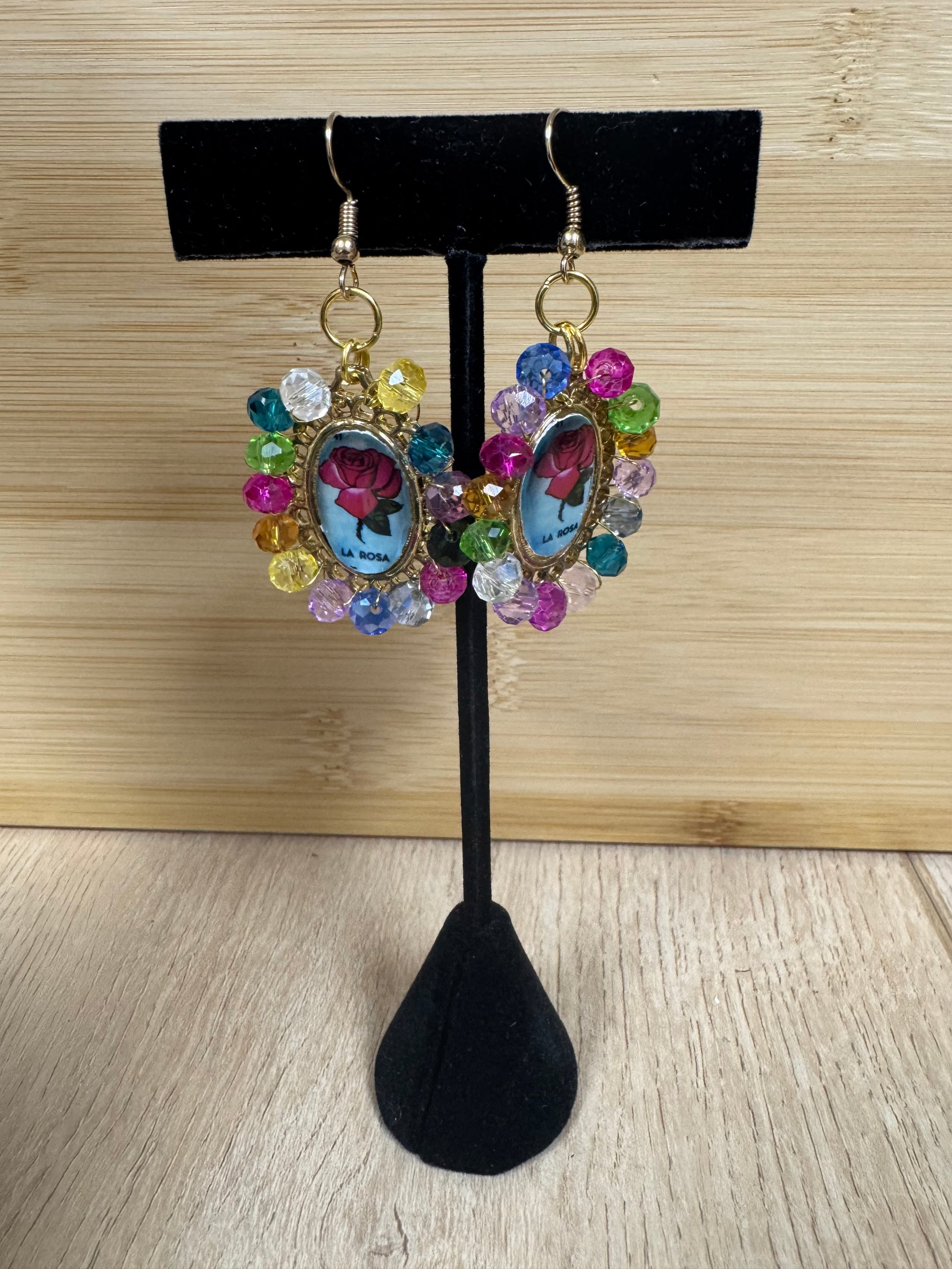 A romantic, symbolic classic from the Lotería deck — La Rosa. These earrings are handmade in México and finished with bright multicolor crystal beads for a glossy, sparkling look. Every pair blends cultura + color, giving you an artisanal accessory that feels both nostalgic and stylish. A beautiful pop of color for any outfit.