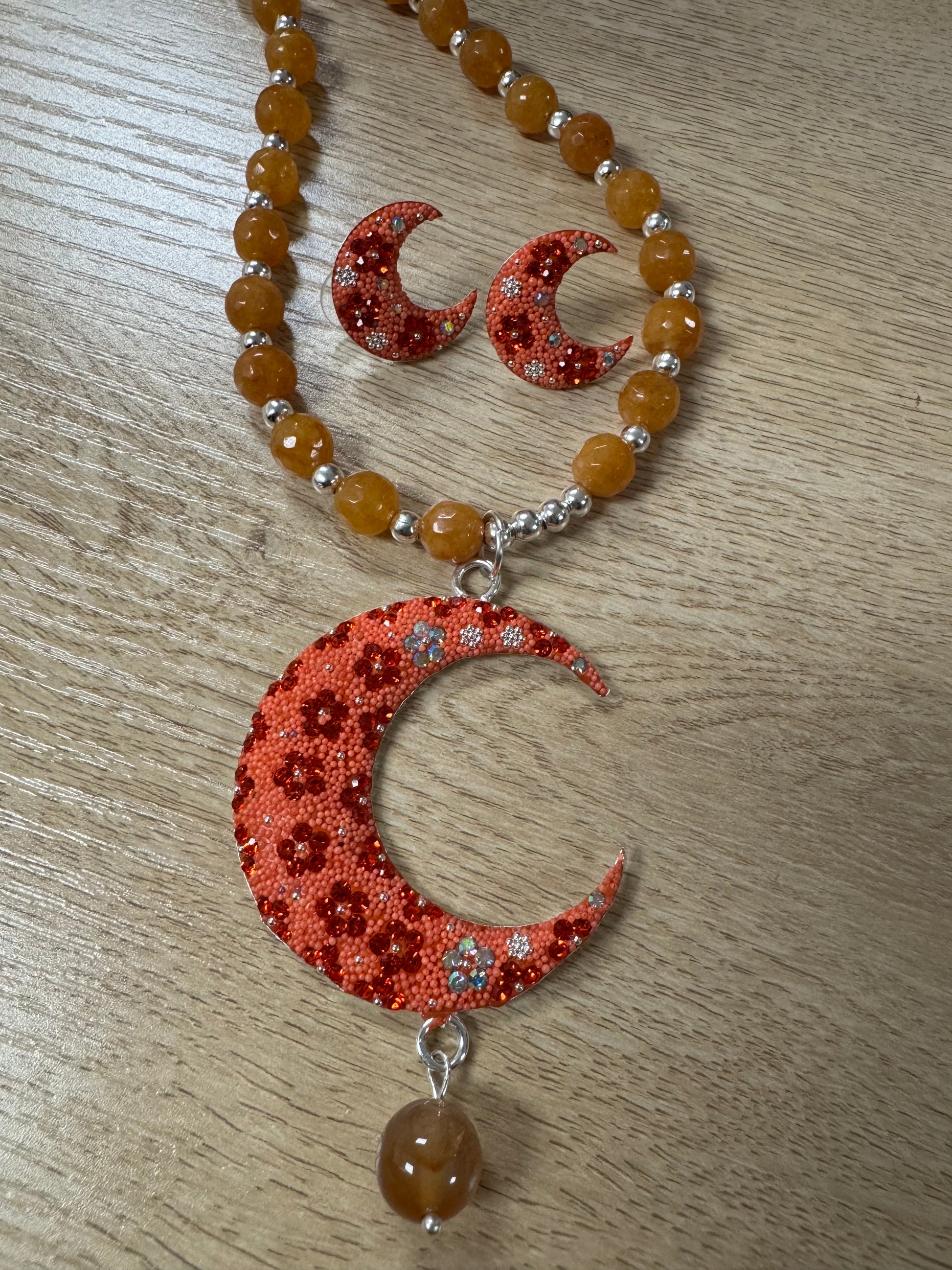 Elevate your look with this handcrafted moon necklace and earrings set. Each piece features an artisan-made crescent moon pendant detailed with intricate beadwork and shimmering accents. The necklace is paired with matching earrings and strung with smooth natural stone beads for a bold yet elegant finish.