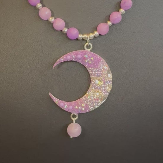 Elevate your look with this handcrafted moon necklace and earrings set. Each piece features an artisan-made crescent moon pendant detailed with intricate beadwork and shimmering accents. The necklace is paired with matching earrings and strung with smooth natural stone beads for a bold yet elegant finish.