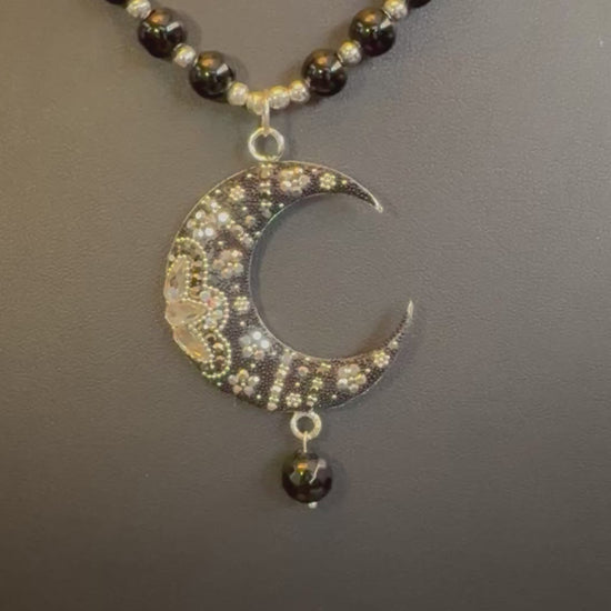Elevate your look with this handcrafted moon necklace and earrings set. Each piece features an artisan-made crescent moon pendant detailed with intricate beadwork and shimmering accents. The necklace is paired with matching earrings and strung with smooth natural stone beads for a bold yet elegant finish.