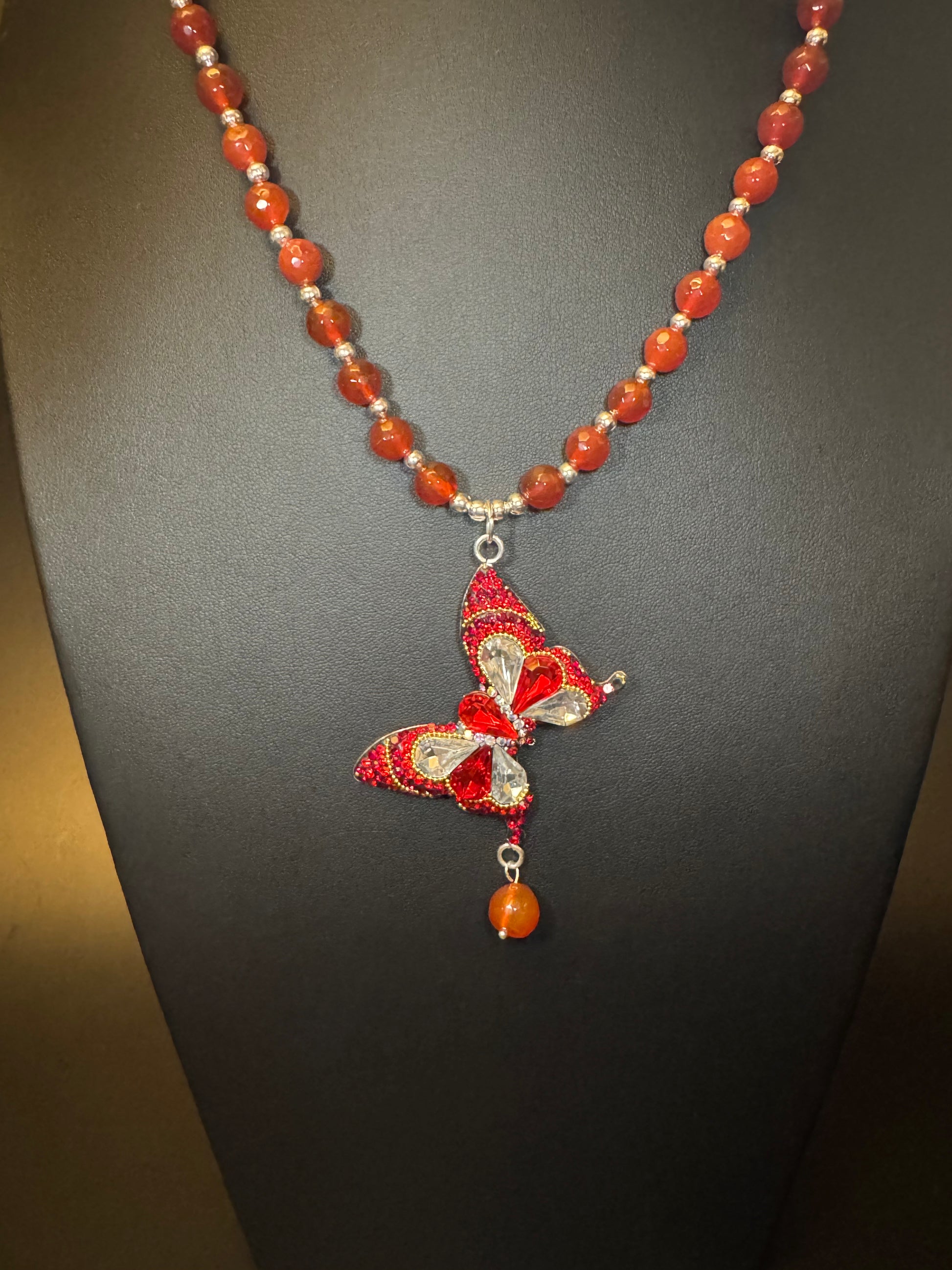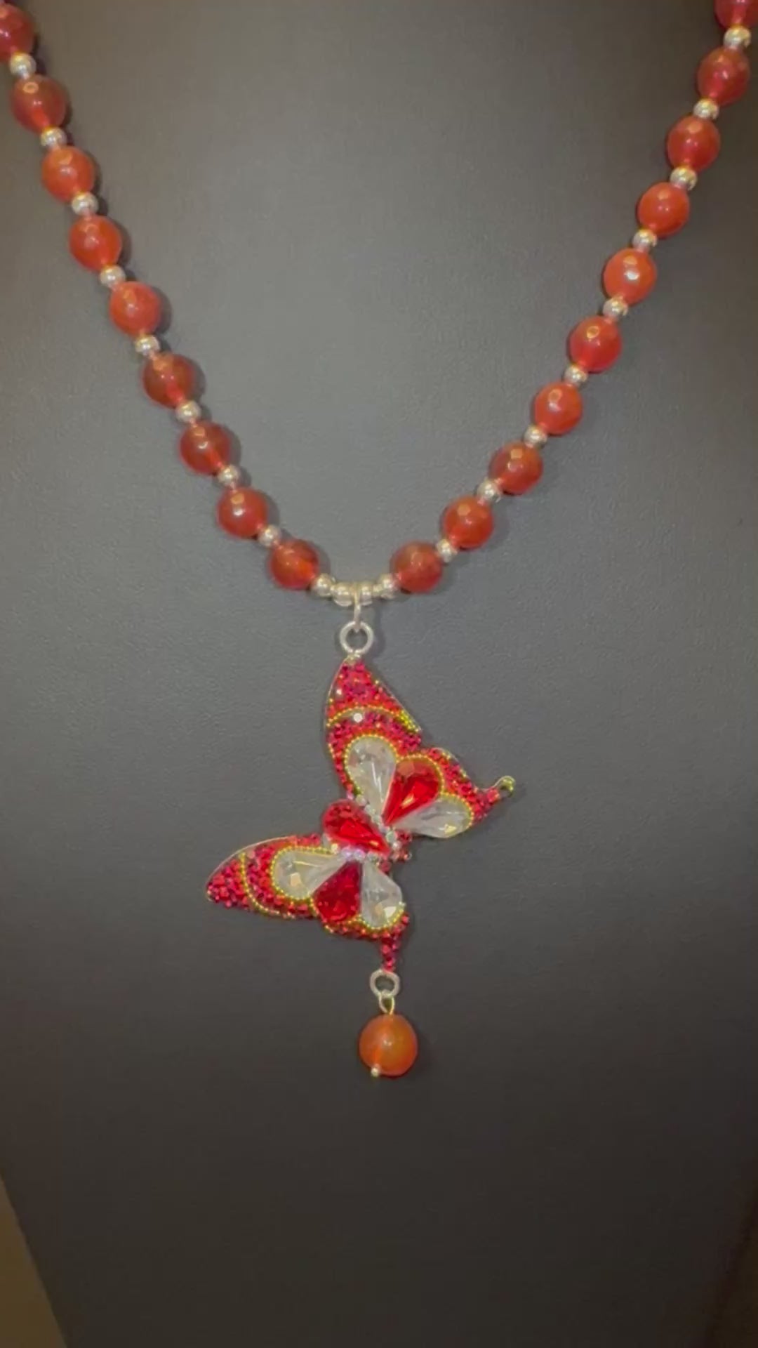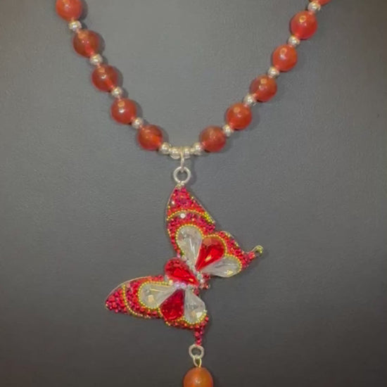 Bring bold, radiant beauty to your look with this handcrafted butterfly necklace set. Each piece features an intricately beaded butterfly pendant paired with a matching pair of earrings. Made by Mexican artisans, this set blends vibrant crystals, detailed beadwork, and natural stone accents for a stunning, one-of-a-kind finish.