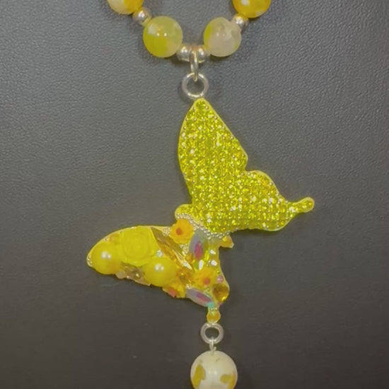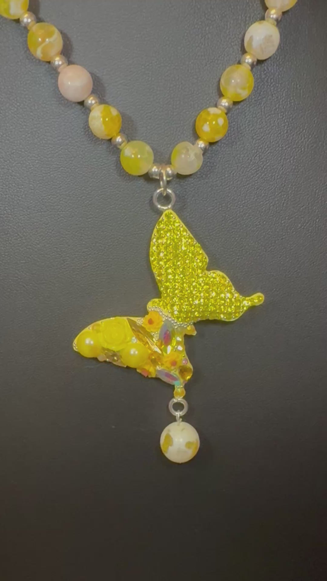 Bring bold, radiant beauty to your look with this handcrafted butterfly necklace set. Each piece features an intricately beaded butterfly pendant paired with a matching pair of earrings. Made by Mexican artisans, this set blends vibrant crystals, detailed beadwork, and natural stone accents for a stunning, one-of-a-kind finish.